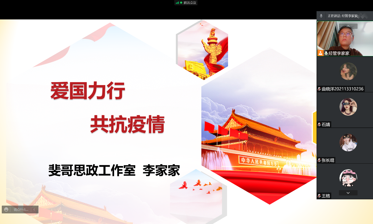 为弘扬抗疫精神,凝聚奋进力量,10月22日,太阳集团tyc539以腾讯会议直播的形式召开“爱国力行,共抗疫情”主题教育讲座,讲座由公司辅导员、斐哥思政工作室成员李家家主持,部分毕业生参加。