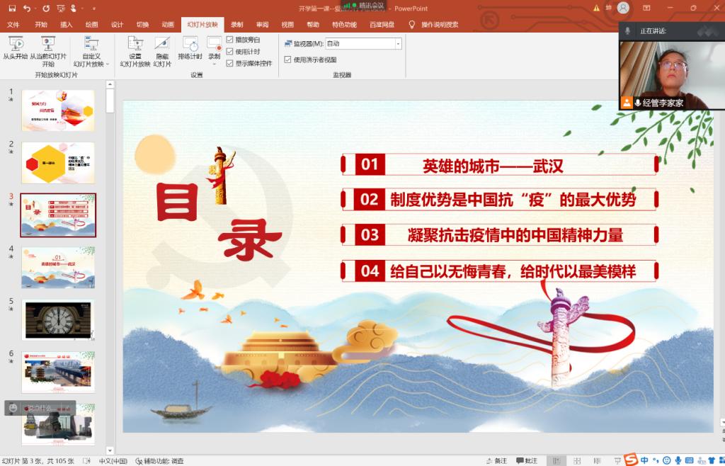 本次讲座围绕“制度优势是中国抗疫的最大优势、凝聚抗击疫情中的中国力量、给自己以无悔青春,给时代以最美模样”三个方面内容展开。讲座中,李家家首先结合当前疫情防控形势,举例向同学们讲解了抗议中的先进典型与志愿者故事。她指出制度优势是中国抗“疫”的最大优势,我们要坚持中国共产党的领导,坚决拥护有中国特色的社会主义制度,表明凝聚抗击疫情中的中国精神力量对防疫抗疫有着积极的促进作用。稍后,李家家讲述了在抗疫过程中,新时代青年人不畏艰险、逆向而上,挺身而出的担当精神。呼吁员工做一个有担当、有本领、有理想有情怀的青年人。最后,李家家给同学们讲解了传染病和新冠肺炎的基本知识,从如何勤洗手、如何正确佩戴口罩等方面讲解了员工个人防护知识,阐述了校园和食堂的常态防控要诀。