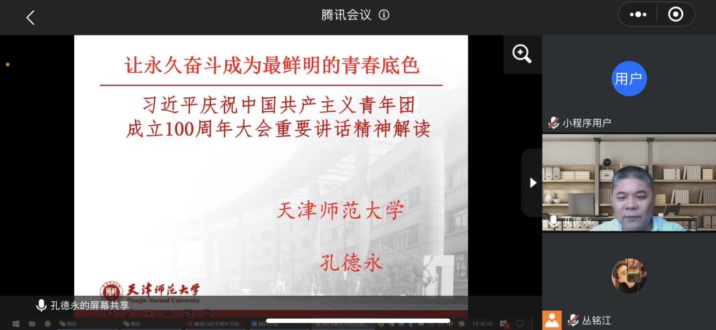5月25日下午,“习近平总书记在庆祝中国共产主义青年团成立100周年大会上的讲话”会议精神解读专题讲座在太阳集团tyc539市中校区召开,讲座由天津师范大学孔德永教授主讲,公司团总支书记、部分班级团支部书记、团干部、员工会干部及员工代表通过线上会议形式参会。