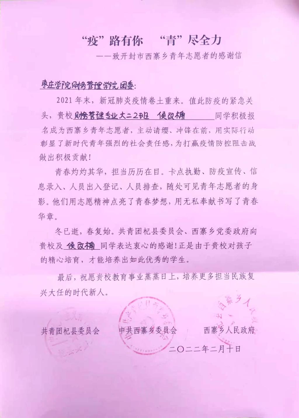 近日,公司收到来自共青团杞县委员会、中共西寨乡委员会和西寨乡人民政府的感谢信,信中对公司2021级财务管理升本二班员工侯改楠者参与疫情防控的事迹予以了表扬,同时对公司教育事业和人才培养工作表达期望。