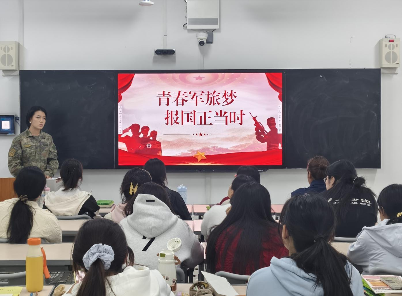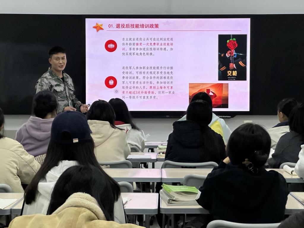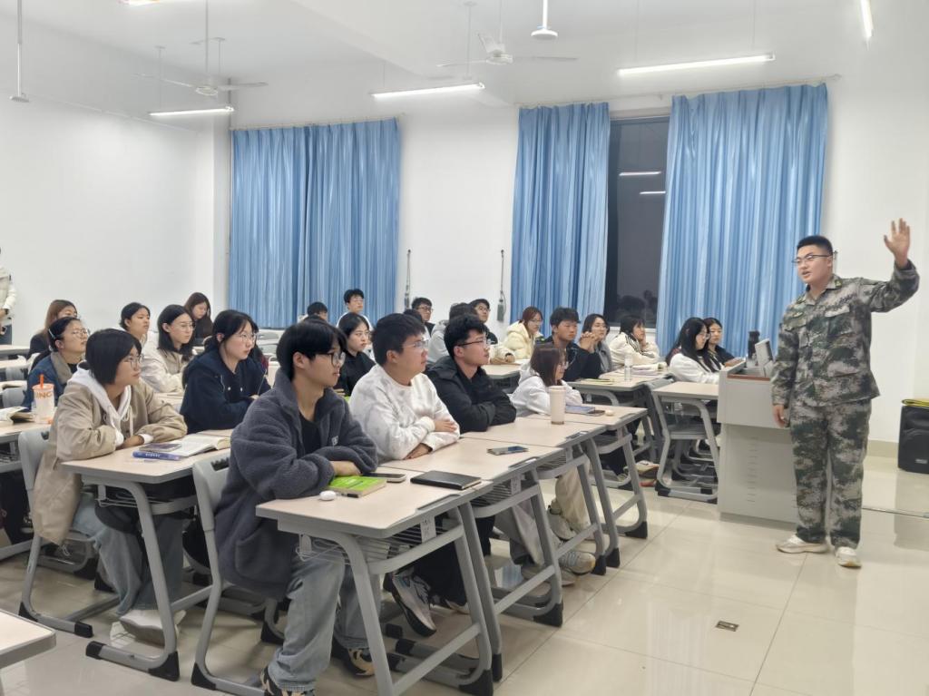 在宣讲过程中,退伍老员工们结合《中华人民共和国兵役法》和最新征兵政策,从报名条件、流程安排、优待政策、发展路径四个维度进行系统讲解。针对经管学子关注的“入伍与学业平衡”“经济待遇保障”“考研升学优惠”等问题,通过数据对比和案例分析,详细阐释了老员工入伍的专项政策,帮助25级新生建立对军旅生涯的科学认知。同时,退伍老员工们结合自身军旅经历,分享了他们在部队的训练生活、成长蜕变与收获感悟,生动讲述了军营生活的独特魅力,朴实而真挚的分享引发了现场学子的强烈共鸣。
