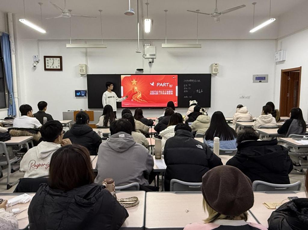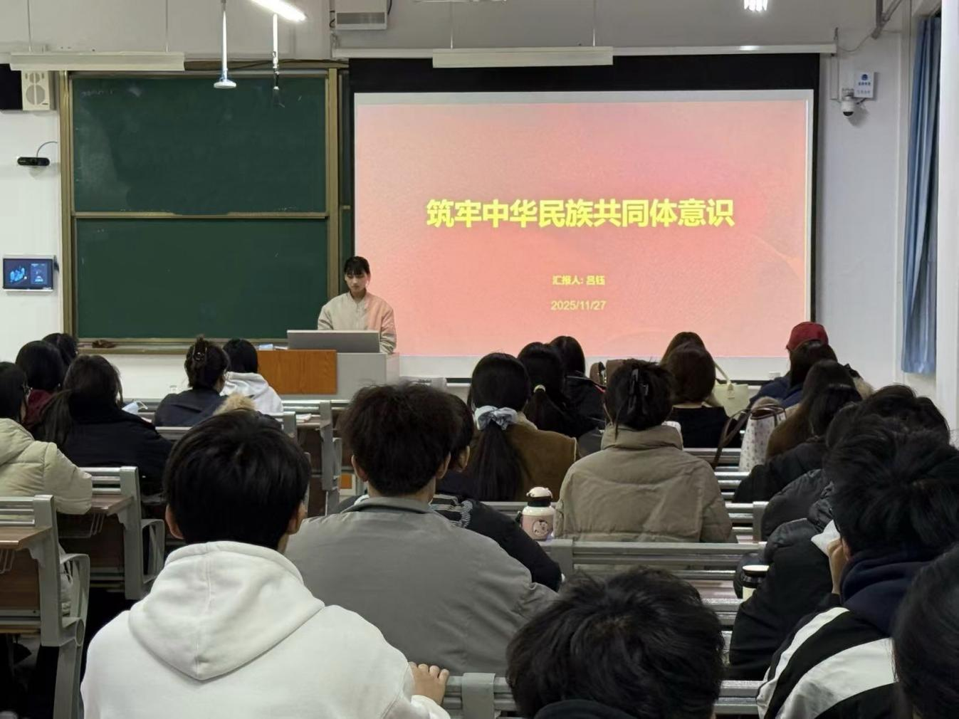 班会上,各班级系统学习了中华民族共同体意识的历史脉络、核心内涵与时代价值,通过分享身边促进民族团结的生动事例,进一步深化了对“中华民族一家亲,同心共筑中国梦”的理解。各班级同学从历史、现实与未来三个维度进一步认识到铸牢中华民族共同体意识的重要性,并承诺将以实际行动争做中华民族共同体意识的坚定信仰者、积极传播者和模范践行者。